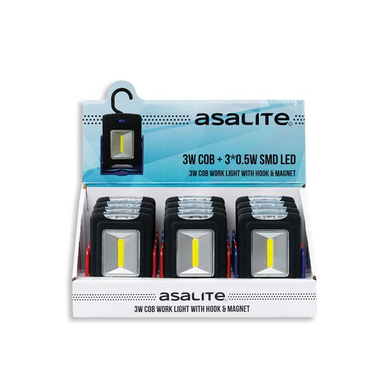 The Asalite 3W LED Flashlight illuminates with 100 lumens and has a range of up to 10 meters. Due to its rugged, durable design, it is also used as a work light. Its magnetic surface and top hook make it easy to place