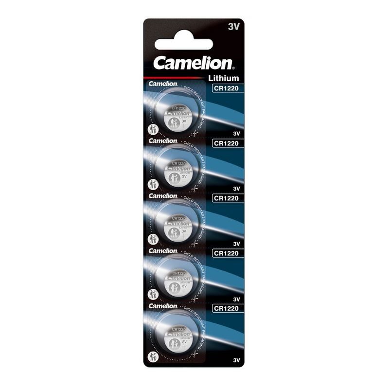 Camelion celulă buton CR1220 în pachet de 5 buc/blister cu sistem electrochimic litiu-ion şi tensiune de 3V. Capacitatea celulelor: 38mAh.